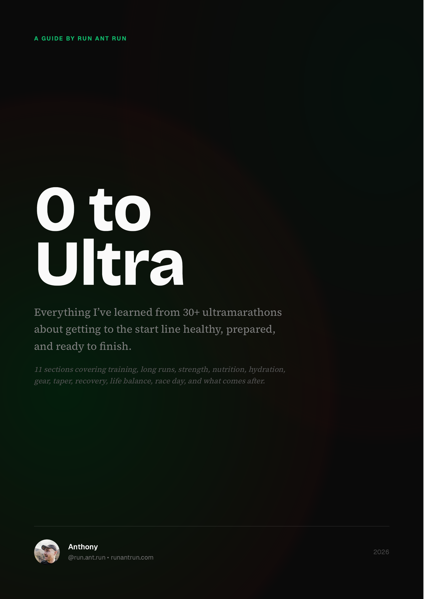 Everything I've learned from 30+ ultramarathons, packed into one guide. Training, nutrition, gear, recovery, race day strategy, and all the stuff I wish someone had told me.